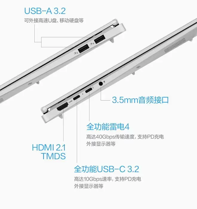 接口配置上,酷睿版提供了全功能雷电4、全功能USB-C、双USB-A以及一个HDMI 2.1接口;而锐龙版则将雷电4接口更换为全功能USB4(速率相同)。