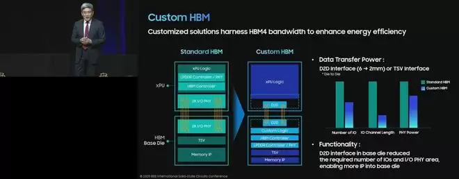 ▲ 三星电子代表在IEEE ISSCC 2025会议上演示的方案构想中,内存控制器与定制逻辑单元位于基础裸片上