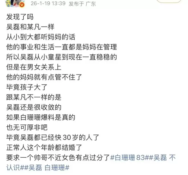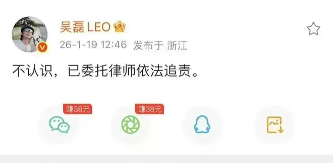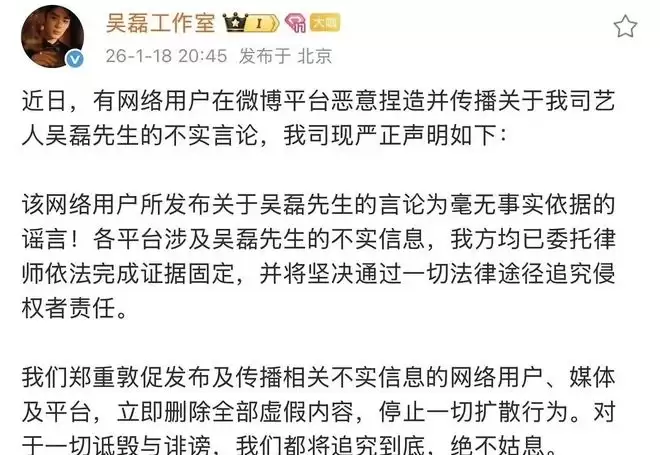 吴磊本人的态度更是强硬又干脆,1月19日午间直接发文回应:“不认识,已委托律师依法追责”,没有多余的辩解,没有模棱两可的表述,给那些含糊其辞的明星声明做了个好榜样。