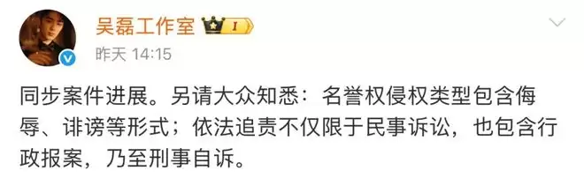 直到吴磊工作室紧急普法,告诉大家名誉权侵权包括侮辱、诽谤等形式,依法追责可不光是民事诉讼,还包含行政报案乃至刑事自诉。