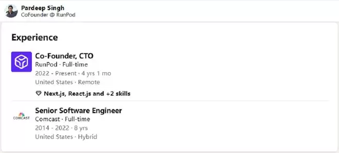 Pardeep Singh没有分享自己的教育背景。步入职场后,他一直在Comcast工作,直到与Zhen Lu联合创办RunPod。