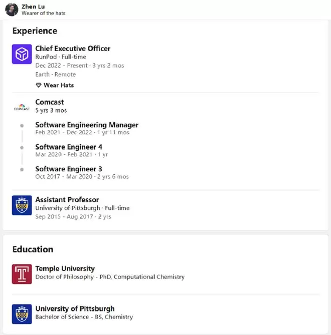 RunPod的两位联合创始人,其实都不是正统的AI科班出身。Zhen Lu本科毕业于匹兹堡大学化学系,获得科学学士学位,紧接着前往天普大学修读计算化学,并获得博士学位。