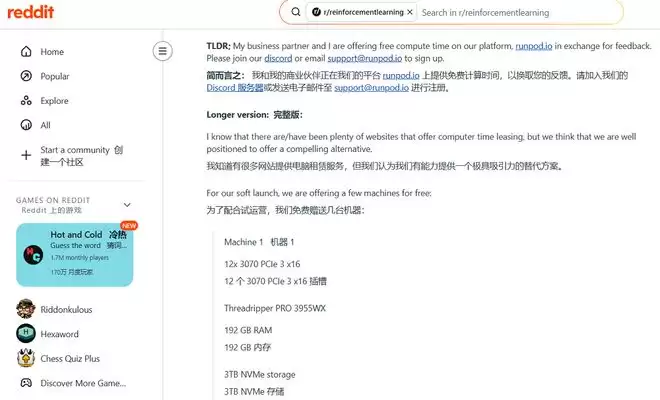 ▲RunPod在Reddit“强化学习”社区发布的试用帖子