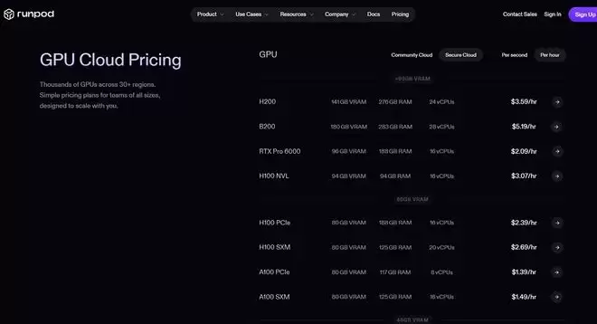 在此基础上,RunPod推出“双轨架构”:社群云(Community Cloud)强调开放与灵活性,适合探索和实验;安全云(Secure Cloud)则提供更高等级的硬件、网络和安全保障,运行在T3/T4级别的数据中心里,可用性超过99.98%,可满足生产环境的严格要求。