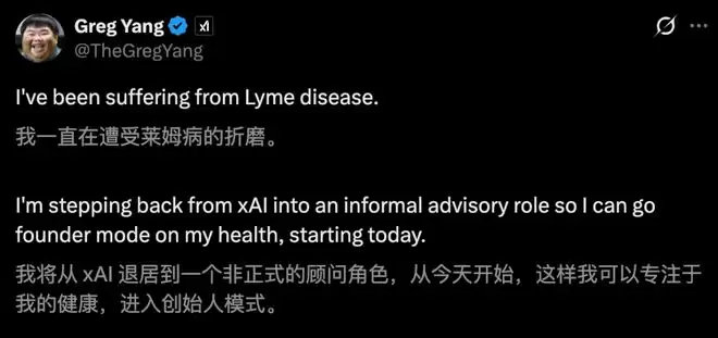 【新智元导读】太突然了!马斯克xAI核心架构师、联创之一杨格宣布离职,转任非正式顾问。他首次公开长期与「莱姆病」斗争的经历,等到满血复活再复出。