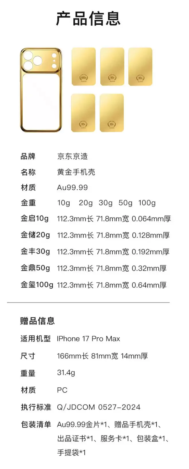 京东Au99.99黄金手机壳限量发售:为iPhone 17 Pro Max披上铠甲