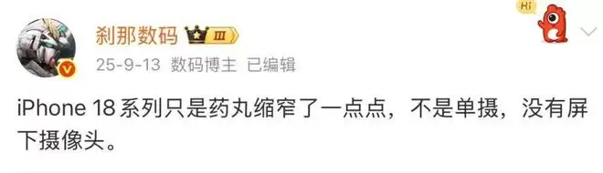 与此同时,这位博主的另外一份消息也提到过,iPhone 18系列并不会带来单摄方案,但是会将“药丸”打孔进行一定的缩小。