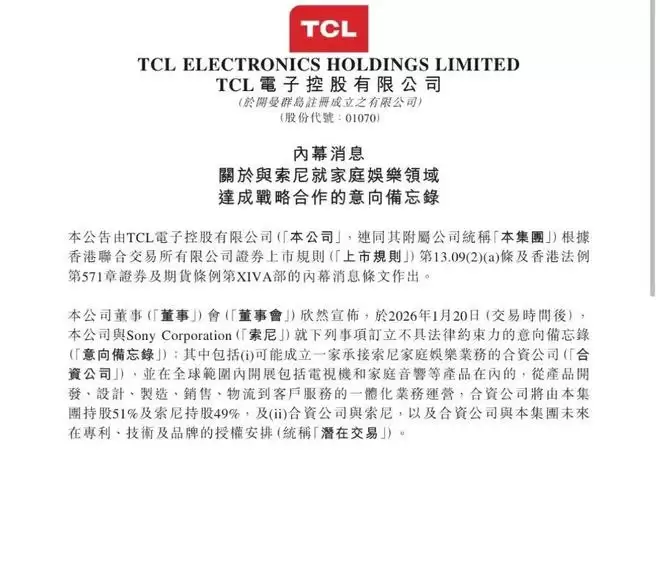 2026年1月20日,TCL电子和索尼公司发布公告称,双方签署了意向备忘录,在电视等家庭娱乐领域达成战略合作。
