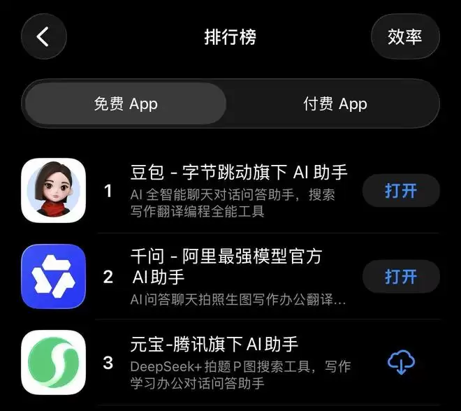 去年以来,众多国产 AI 工具应用霸榜 App Store 等手机应用商店,尤以字节跳动系的豆包、阿里巴巴系的千问。腾讯系的元宝,虽然也在下载榜较前位置,但一个新兴应用行业只会记住排行榜的老大,甚至连老二都不会多看几眼。