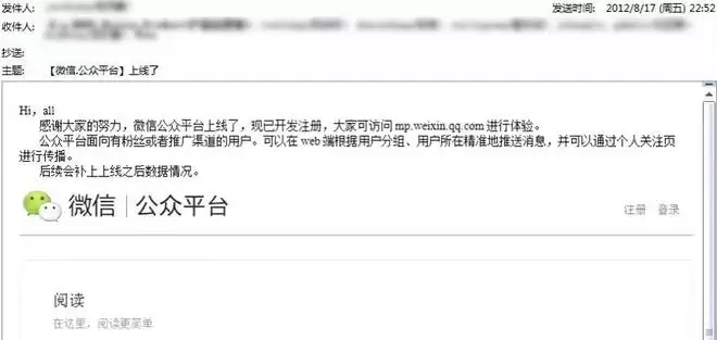 同样是在 2012 年 8 月,微信公众平台上线。以内容平台建设为切入,微信开始走出一条不同于 QQ 的新路。