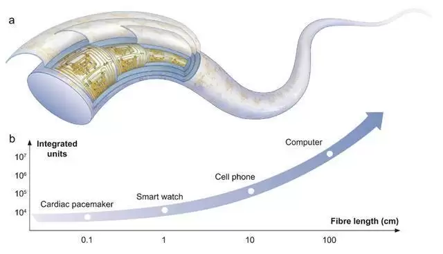 团队跳出“仅利用纤维表面”的惯性思维,提出多层旋叠架构的设计思想,即在纤维内部构建多层集成电路,形成螺旋式旋叠结构,从而最大化地利用纤维内部空间。基于实验结果推算,即便按照目前实验室级1微米的光刻精度,长度为1毫米的“纤维芯片”可集成1万个晶体管,其信息处理能力可与植入式起搏器芯片相当;若“纤维芯片”长度扩展至1米,其集成晶体管数量有望提升至百万级别,这一集成数量将超过经典计算机中央处理器(例如英特尔386TM SL)的晶体管集成水平。