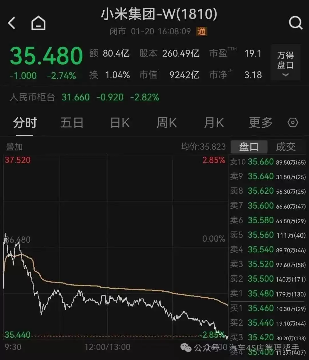 资本市场对这两起事件的反应迅速且剧烈。1月20日港股收盘时,小米集团-W股价下跌2.74%,报收35.48港元/股,盘中更是一度触及35.44港元,创下近一年来的新低。数据显示,自2025年9月下旬股价接近60港元的高点以来,小米股价已累计下跌超过40%,市值蒸发规模达5600亿港元,相较于其历史峰值缩水6764亿港元。