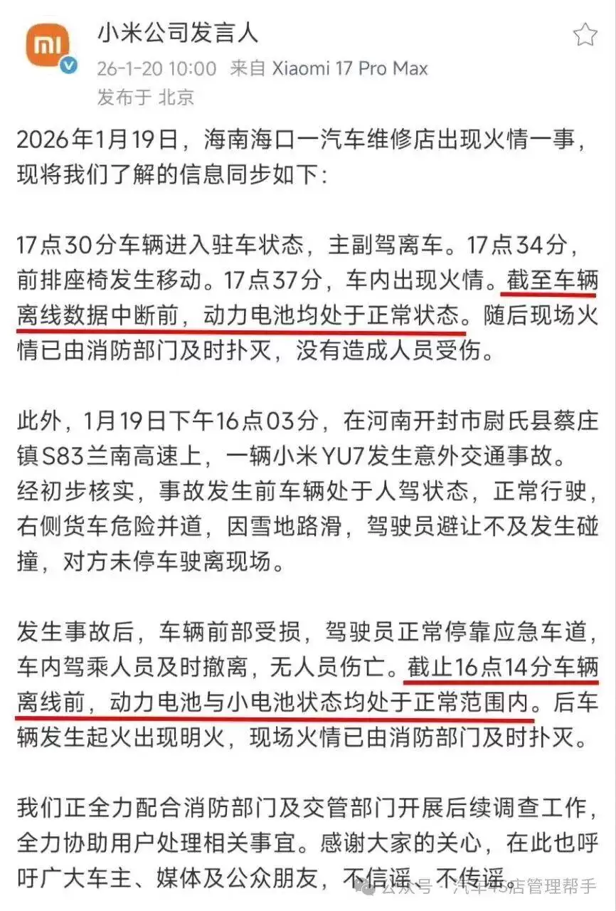 针对这两起事件,小米公司发言人在次日通过官方渠道发布声明,强调在事故发生前,车辆离线数据显示,动力电池与12V小电池均处于正常工作状态。对于高速事故,公司认为起火源于外部碰撞以及雪地路滑;而对于维修店内的火情,小米则披露了详细的时间线:车辆于17:30完成驻车并断电离车,17:34车内座椅发生异常位移,17:37便出现明火。小米承诺将全力配合消防及交管部门调查,并呼吁公众理性看待事件,避免传播未经证实的消息。