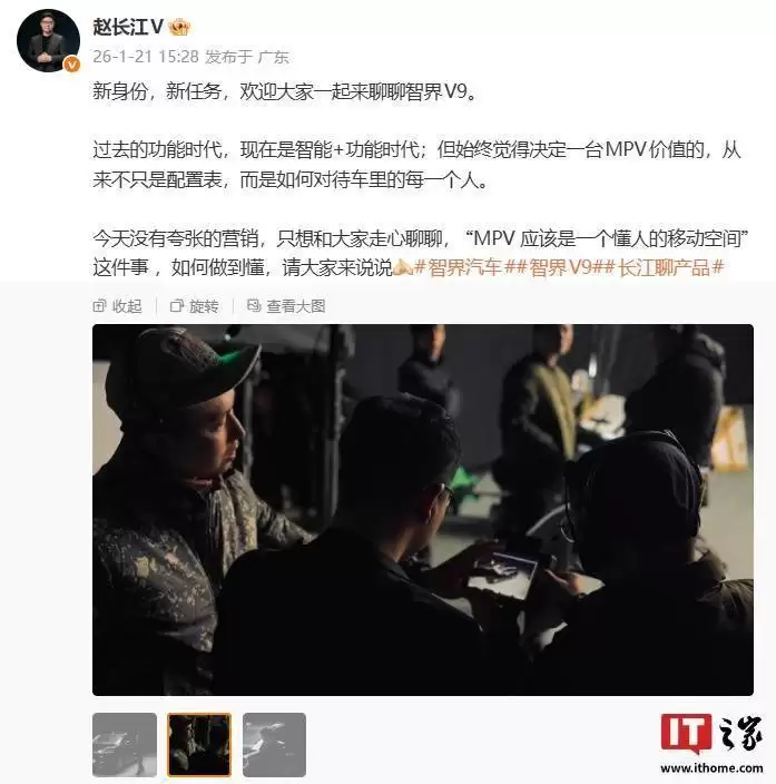 这一观点引发行业关注的同时,赵长江同步公开了智界品牌首款MPV车型V9的实车影像。从曝光的画面可见,新车采用了极具未来感的流线型设计,车身比例协调,车窗轮廓与腰线形成优雅的视觉过渡,展现出不同于传统MPV的科技美学特质。