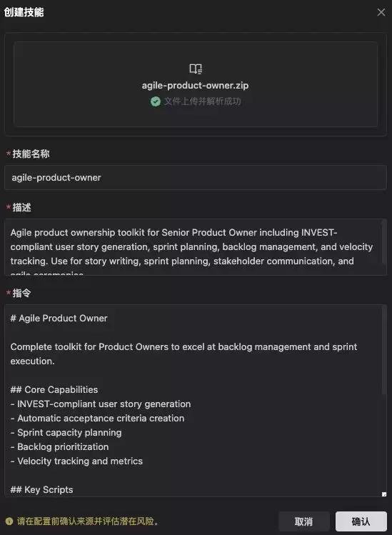 比如,我们下载了一套在社区非常流行的“全栈产品团队技能 Skills”,里面涵盖了敏捷产品负责人、产品经理工具、产品策略师、UI 设计系统以及用户调研这五个核心角色的能力。在 TRAE 里,你不需要任何复杂的配置,只需将这五个文件夹一键拖入设置面板。导入后,你的 TRAE 就不仅仅是一个编辑器,而是原地组建了一支由 AI 构成的专业产品战队。