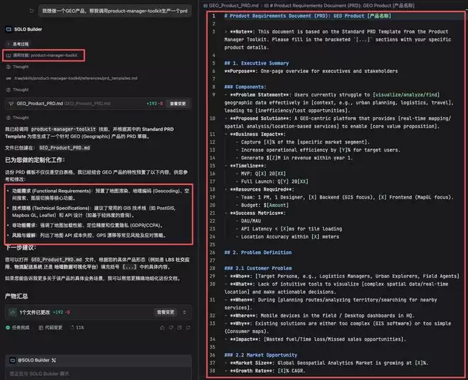 而当你指定“调用 Product Manager Toolkit 写文档”时,AI 会迅速切换至专业模式,严格执行 GEO 产品 SOP:自动补全“外勤人员路径规划”的用户故事,自动补充“GPS 信号漂移修正”和“地图瓦片离线缓存”的异常处理逻辑,甚至自动列出“API Latency < 200ms”和“GDPR 合规性”等具体的验收标准。