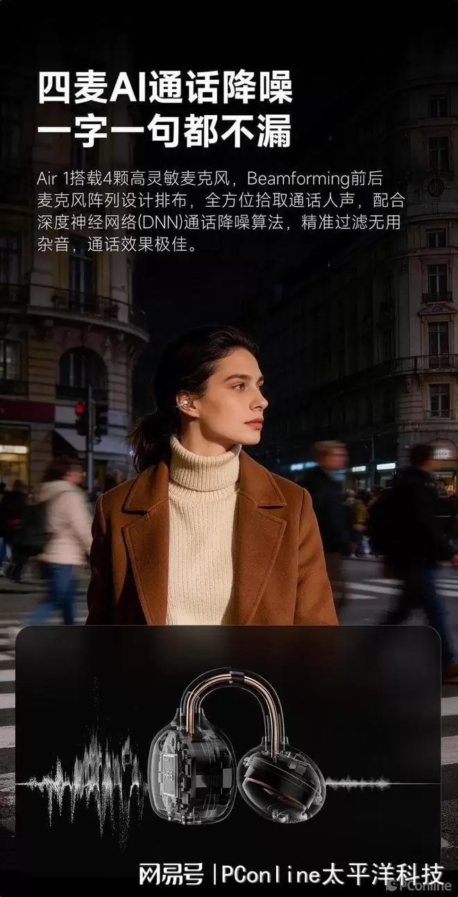 在佩戴结构上,当贝耳机 Air 1采用更符合人体工程学的零压钛芯记忆无感C桥,材质柔韧耐用且能自适应不同耳廓形状。单耳重量仅为 6.1g,配合亲肤硅胶材质与“云感豆” 贴耳设计,可分散 60% 佩戴压力。耳机已通过德国莱茵TÜV舒适度认证,无论是伏案办公还是户外运动,都能实现“稳固不夹耳,久戴不累”的零感体验。耳机搭载的AI 声道自适应功能,无需手动区分左右耳,随手一夹即可自动匹配声道,通勤赶时间也能 “一夹就走”。