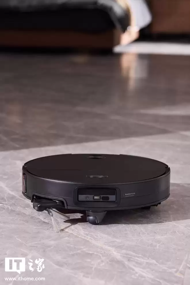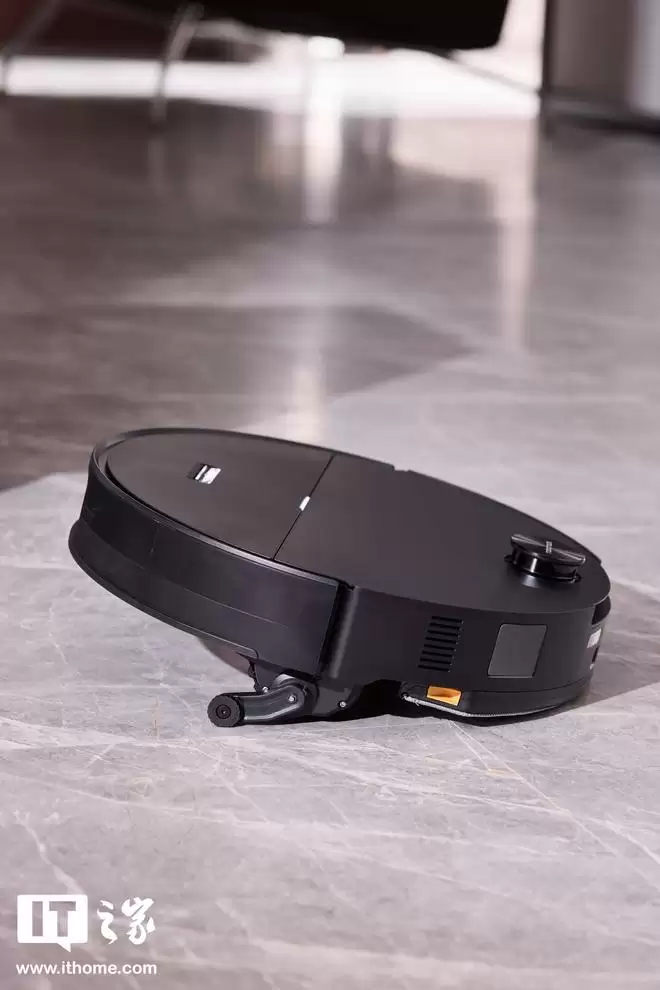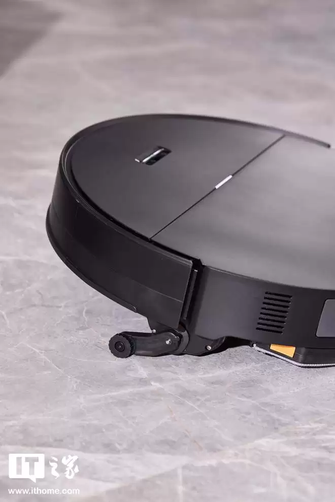 正面设计亮点在于顶部的可升降 LDS 激光雷达。在常规状态下,LDS 雷达升起进行建图和导航;而当检测到前方有床底、沙发底等低矮家具时,雷达模组会自动降下收纳至机身内部,可通过 7.95cm 的低矮空间。