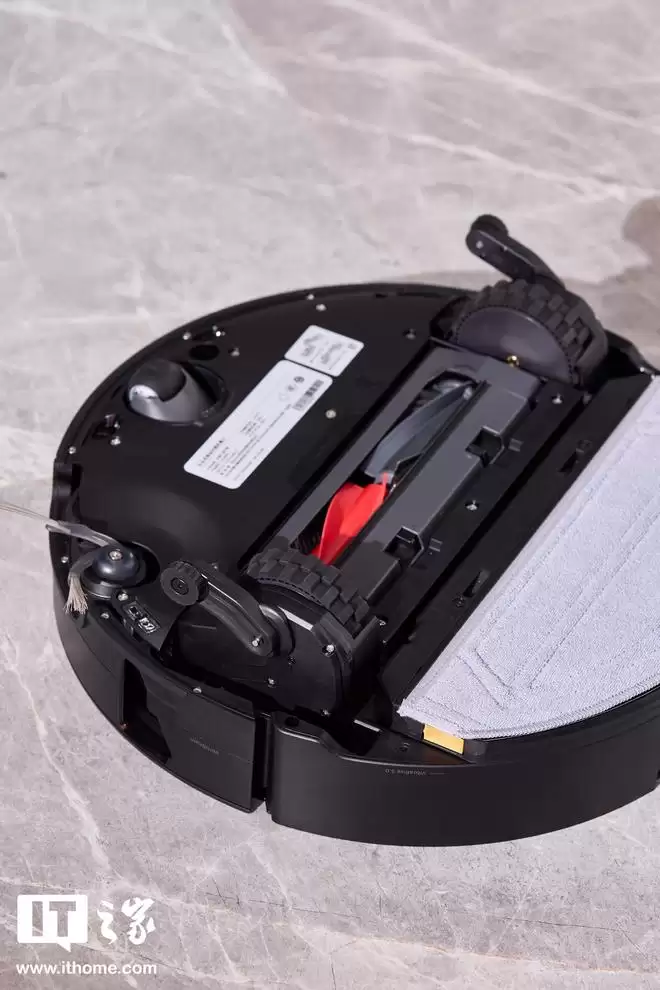 翻转机身,底部的轮组结构是 G30S Pro 与常规扫地机器人最大的区别所在。