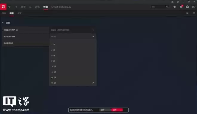 通过 AMD Software 的调节,就能够增加到 96GB。