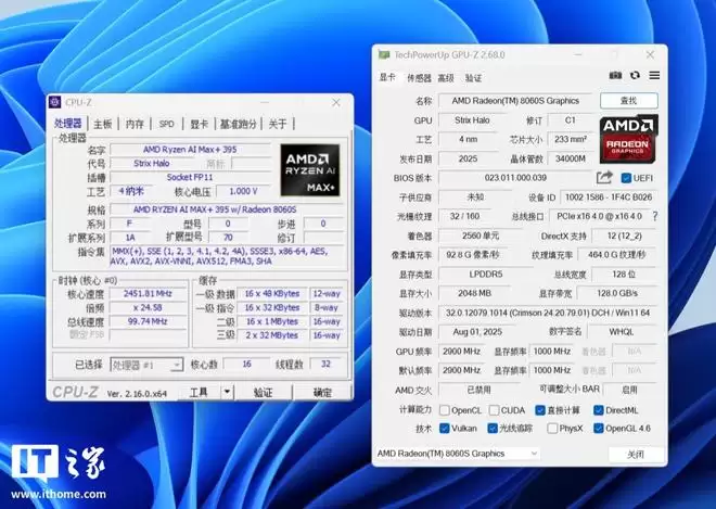锐龙 AI Max+ 395 基于全新的 Zen 5 架构,采用领先的台积电 4nm FinFET 工艺制造,拥有 16 核心、32 线程的设计。其基础频率为 3.0GHz,最高加速频率可达 5.1GHz,并配备 80MB L2+L3 缓存。该芯片的 TDP 热设计功耗为 55W,并支持在 45W 至 120W 范围内进行配置,在性能和能效之间取得了良好平衡,这使其非常适合小型台式工作站使用,并且其规格已达到个人桌面级消费 PC 的顶级水平。