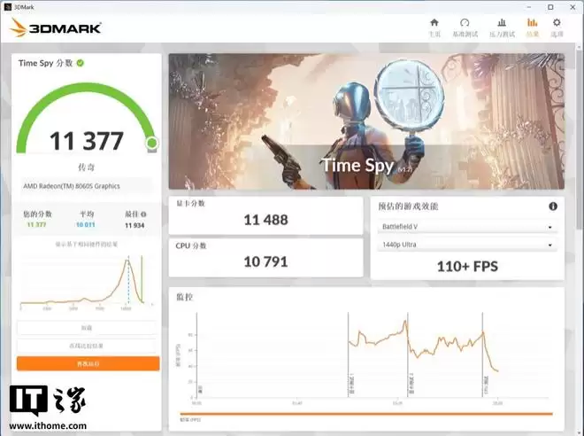在 3D Mark Time Spy 项目中,显卡成绩达到了 11488 分,这个成绩已经超过了桌面端 RTX 4060 显卡的水平。