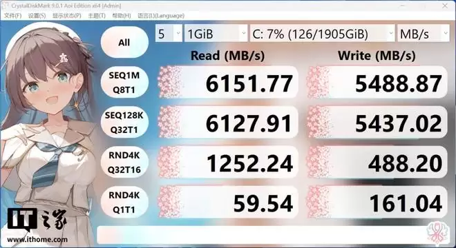 硬盘实测顺序读取速度在 6100MB/s 左右,顺序写入速度在 5400MB/s 左右,表现还是颇为不错的。