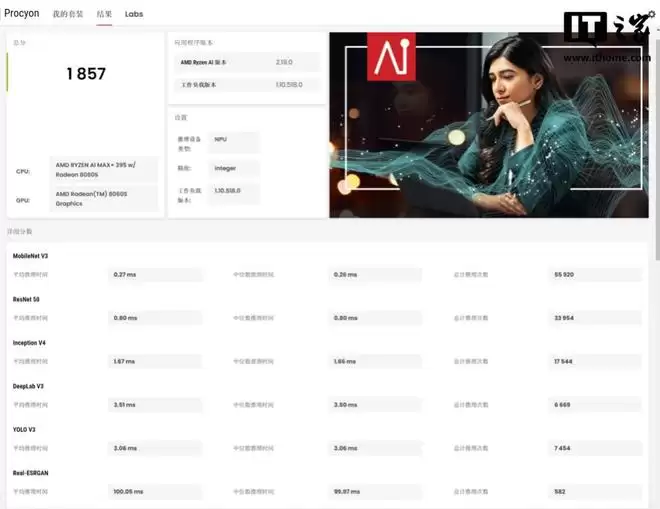 IT之家首先进行了 UL Procyon 的 AI 推理测试,这项以 NPU 进行推理任务的测试,得分 1857 分。