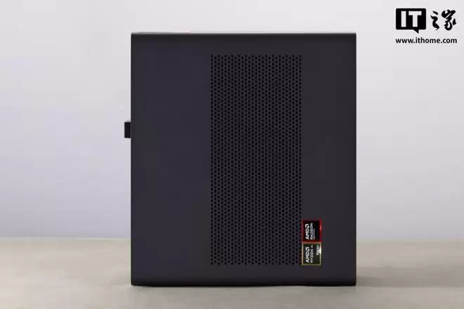 考虑到强大算力带来的散热压力,机身前、后侧面都设计了大量散热风道网格,正面采用菱形矩阵散热网格,配合悬浮切割的钻石镶嵌元素,兼顾了功能性与美感。面板接口区域红色的「AI」标识,既作为点睛之笔增添了整机的设计感,也强调了整机的定位。