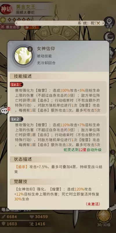 “泰攀蛇体质”是黄金女王的固定被动增益,为她提升25%攻击和15%生命。10星时技能自动升级到二级,此时可以提升35%攻击和20%生命。18星时则拥有45%攻击、25%生命和10%伤害加成。最后的“女神信仰”虽然也是被动,但技能效果比基础增益更强,这里会让黄金女王的普攻强化为【煌雷】,然后造成100%攻击+5%目标生命上限的伤害,这个数值不会超过黄金女王攻击的3倍,且在敌方单位阵亡后可以获得1层【追击】。一直到行动结束之后,就会对敌方随机目标进行1次【煌雷】攻击,每拥有1层【追击】的时候可以额外攻击1次,最多的时候可以攻击到5次。12星的时候这个普攻会强化为造成110%攻击+7%目标生命上限的伤害,让敌方的这个目标阵亡,黄金女王还可以获得1层【追击】的效果,她每拥有1层【追击】就会有额外攻击1次的能力,最多是可以看到增加攻击5次的。