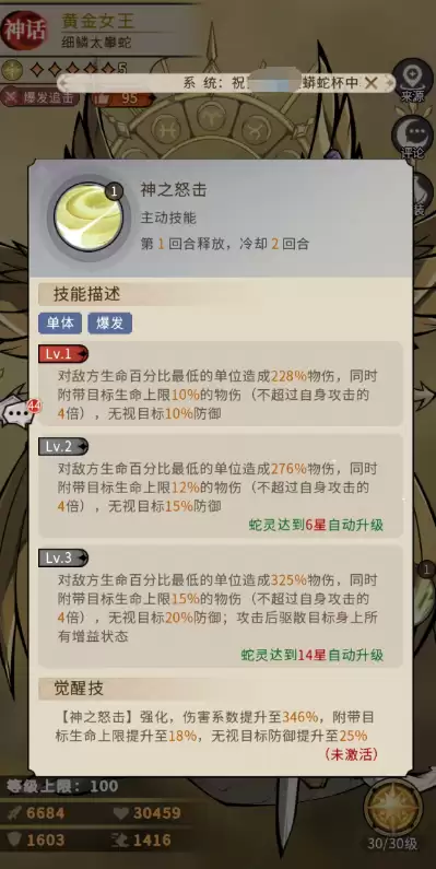 她的第一个技能“神之怒击”,是一个主动单体爆发技能,使用时可为我方全体带来增益。当攻击敌方生命百分比最低的目标时,能造成228%的物理伤害,并附加一个使目标生命上限降低10%的物理伤害效果。需要注意的是,这里的物理伤害不能超过自身攻击力的4倍,且可以无视敌人10%的防御数值。当蛇灵升至6星后,此技能变为对敌方生命百分比最低的一个目标造成276%的物理伤害,并附带令目标生命上限降低12%的物理伤害输出,同时无视敌方防御的效果会提升至15%。最高升至14星时,技能升级为对敌方生命百分比最低的角色造成325%的物理伤害,附带目标生命上限降低15%的物理伤害,此时的无视防御数值变为20%。此外,攻击后还能驱散目标身上的增益状态,效果非常出色。而在觉醒之后,“神之怒击”技能得到强化,伤害数值可提升至346%,同时附带的目标生命上限降低效果提升至18%,无视目标防御的数值也提升至25%。