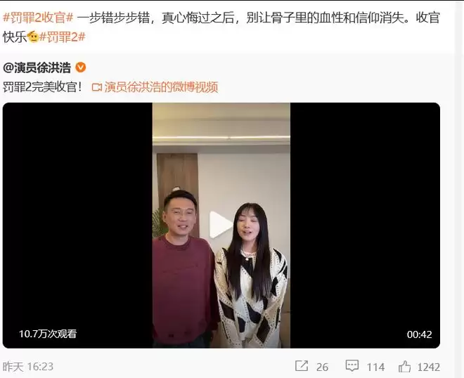 徐洪浩告别彭含章,“罚罪2完美收官!”还带着老婆刘晓洁一起发了告别视频,刘晓洁在剧中扮演文波妈妈,夫妻俩没对手戏。刘晓洁感谢观众喜爱,徐洪浩道歉没演好人,还说下次努力演个好人。