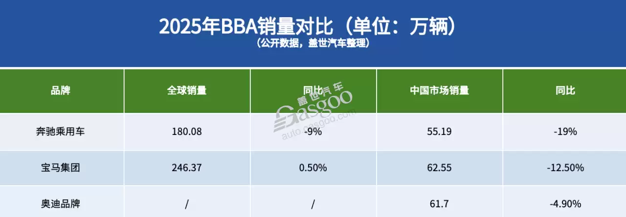 尽管豪华车市场持续增长,传统豪强品牌却陷入集体滑坡。奔驰、宝马、奥迪(BBA)2025年在中国的销量均出现明显下滑。其中奔驰全年交付55.2万辆,同比减少近两成;宝马卖出62.6万辆,降幅12.5%;奥迪则以61.7万辆收官,下跌4.9%。这一趋势直接拖累其全球业绩:宝马全球交付量仅微增0.5%,奔驰则下滑9%。奥迪虽未公布完整数据,但其在中国市场的疲态已成不争事实。