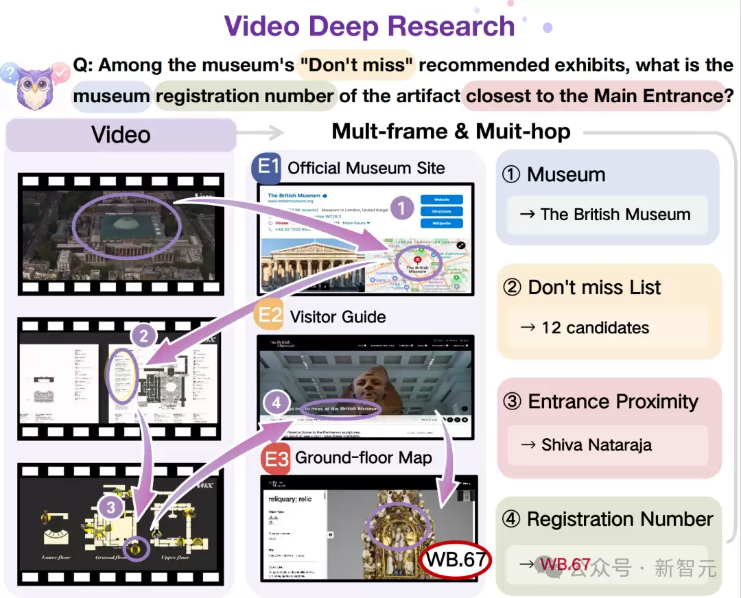 这不仅需要看懂视频内容(识别展品、定位位置),还需要跳出视频本身,去博物馆官网查找地图、推荐列表和编号信息。