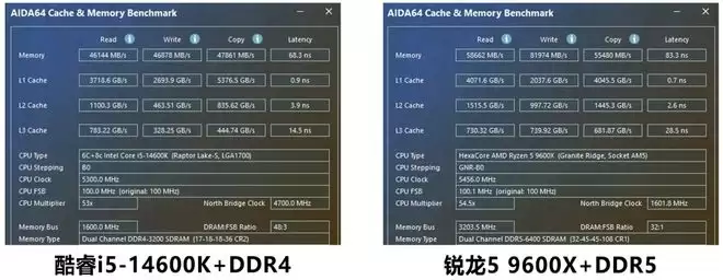 由于两款处理器搭配的内存不同,必然在性能上有一定的差异。锐龙5 9600X搭配的是DDR5 6400MT/s内存频率是DDR4 3200MT/s的两倍,所以在内存带宽上优势明显:锐龙5 9600X+DDR5平台的读取带宽为58662MB/s、写入带宽为81974MB/s、拷贝带宽为55480MB/s,酷睿i5-14600K+DDR4平台的相关成绩为46144MB/s、46878MB/s、47861MB/s,领先幅度分别为27%、74%、15%。