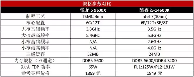 通过简单的对比,孰优孰劣就很明显了。两款处理器实际上都是6核12线程的配置,锐龙5 9600X 5.4GHz的核心频率更高,超频实现起来也更简单,同时32MB的三级缓存也多出了33%,无论游戏吃频率还是吃缓存,都能很好地应对,提供更好的游戏性能。