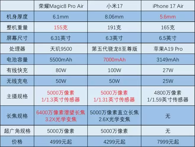 目前主打纤薄设计的机型主要分为两类,一类是以荣耀Magic8 Pro Air、iPhone Air为代表的超薄机型,另一类则是以小米17为典型的标准小屏旗舰。这里我们为大家列出了荣耀Magic8 Pro Air与这些机型的主要规格参数对比,直观呈现荣耀Magic8 Pro Air与同类机型的差异。