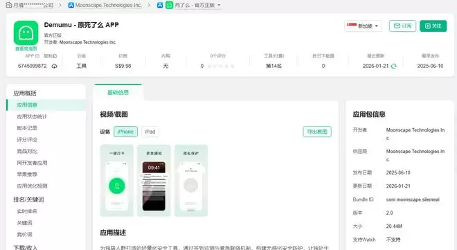 据了解,原“死了么”App由月境(郑州)技术服务有限公司开发,定位为轻量化独居安全工具,此前仅上架了iOS平台。企查查信息显示,月境公司成立于2025年3月,由郭孟初担任法定代表人、总经理职务,创始人吕功骏则出任财务负责人。