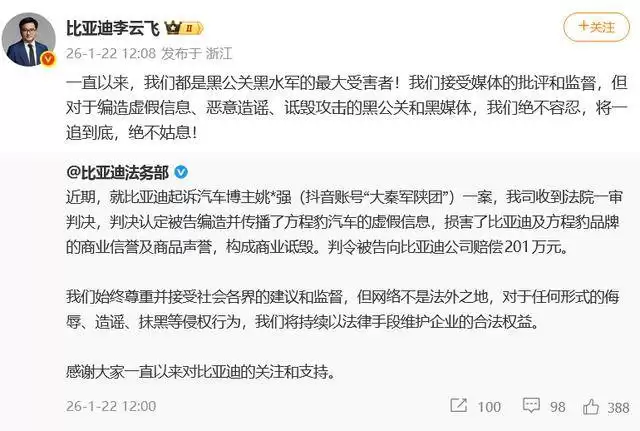 比亚迪再胜诉,汽车博主诽谤被判赔201万!高管回应维权