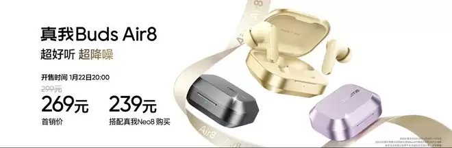 IT之家1月22日讯,在真我Neo8手机发布会上,同场亮相的真我Buds Air8耳机正式登场,定价299元,首发优惠价269元。