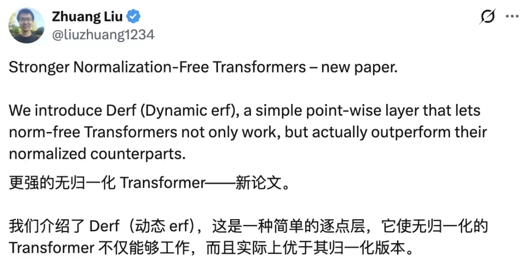 刘壮本人也在 X 账号上分享了这一成果。他表示,这是一篇关于更强无归一化 Transformer 的新论文:研究团队提出了 Derf(Dynamic erf),一种结构极其简单的逐点(point-wise)层。借助 Derf,完全不依赖归一化层的 Transformer 不仅能够稳定训练,而且在实际性能上已经可以超越传统依赖 LayerNorm 等归一化机制的模型。