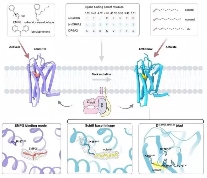 具体而言,研究团队首先解析了or6亚家族的共识序列consor6结构,并系统分析了配体结合口袋。随后,他们通过理性设计,构建出兼具结构稳定性与野生型配体识别能力的or6a2变体bmor6a2。进一步地,研究团队解析了bmor6a2分别与3种天然醛类配体以及嗅觉特异性g蛋白golf形成的复合物结构,最高分辨率达2.5埃。据此,团队实现了对嗅觉受体-配体-g蛋白相互作用的原子级刻画。