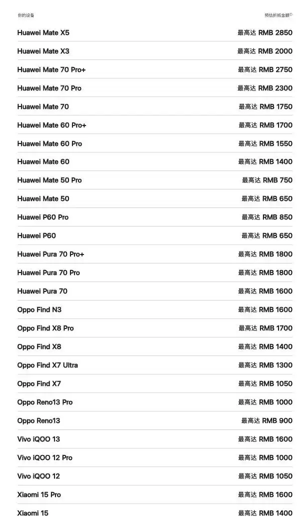 参考来看,Huawei Mate X5最高可抵 2850元、Huawei Mate 70 Pro+最高可抵 2750 元、OPPO Find X8 Pro最高可抵1700 元、vivo iQOO 13最高可抵 1600 元、小米15 Pro 最高可抵1600元。