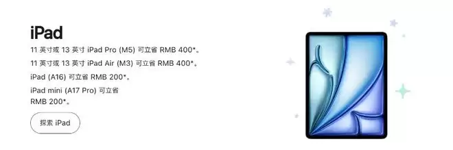 iPad系列中,11 英寸或 13 英寸 iPad Pro (M5) 可立省 400 元、11 英寸或 13 英寸 iPad Air (M3) 可立省 400 元。