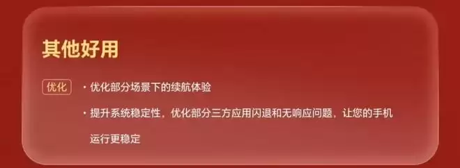 然后就是1月版本针对部分三方应用闪退和后台耗电进行了专项修复,对于用户来说,更新之后的体验会非常稳定。