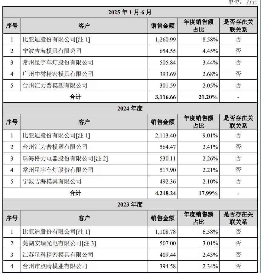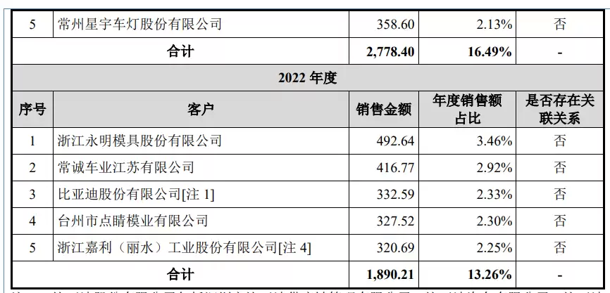 报告期各期,公司前五名客户合计收入金额分别为1,890.21万元、2,778.40万元、4,218.24万元和3,116.66万元,占营业收入的比重分别为13.26%、16.49%、17.99%和21.20%。公司前五名客户主要为汽车主机厂、汽车零部件厂和注塑模具厂等,公司与主要客户维持了良好的合作关系。
