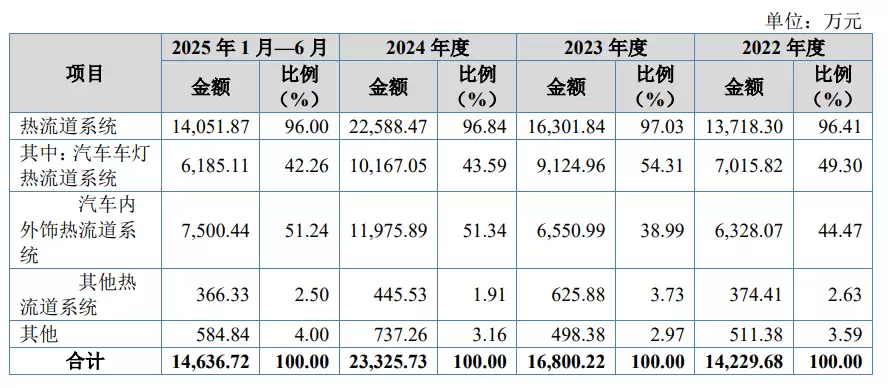 报告期各期,公司主营业务收入分别为14,229.68万元、16,800.22万元、23,325.73万元和14,636.72万元,保持持续稳定增长。报告期内,公司主要产品为热流道系统,该产品收入占比超过95%,是公司主营业务收入的主要来源。
