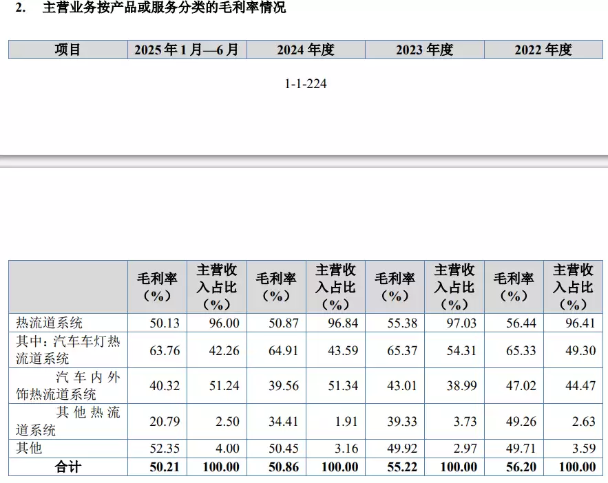 报告期各期,公司主营业务毛利率分别为56.20%、55.22%、50.86%和50.21%。公司主营业务毛利率的波动主要受收入占比最高的热流道系统产品毛利率变动影响。