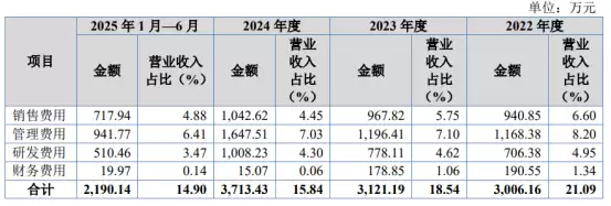 报告期各期,公司期间费用合计分别为3,006.16万元、3,121.19万元、3,713.43万元和2,190.14万元,占营业收入的比例分别为21.09%、18.54%、15.84%和14.90%。随着公司营业收入的增长,期间费用占比有所下降。