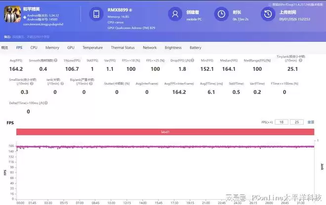 中负载的《和平精英》是其流畅度的直观体现:作为165Hz原生适配的游戏之一,开启165帧模式后,依托触显同步技术与极客面板的均衡模式,半小时测试下平均帧率能有164.2帧,操作跟手无延迟,即便是长时间枪战,也不会出现帧率波动。